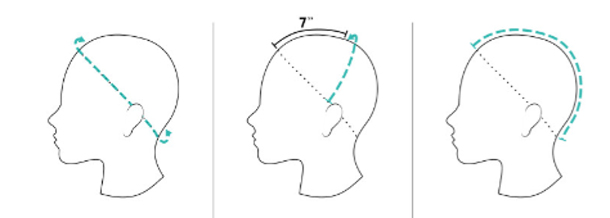 2. Mide del crecimiento de tu frente hacia atras 7 pulgadas. posteriormente mide de donde inicia tu oreja (imagen) a la otra oreja pasando por el punto donde se midieron las 7 pulgadas.
